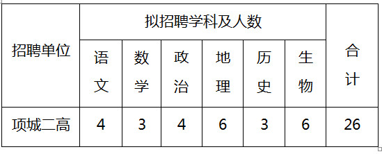 拟招聘项城二高教师26名,均为专业技术十二级及以下岗位,各岗位招聘人数如下: