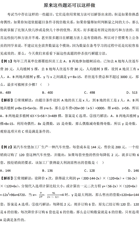 考试当中存在这样的一些题目,它们是你用常规方法可以解答出来的,但是如果你熟悉奇偶性,如果你知道依据题目条件寻找倍数关系,如果你懂得如何判断量之间的大小,那么你就掌握了比别人快几秒或是快几十秒的优势。其实,好多题是有固定的技巧和方法的,而且这些技巧和方法并不难,甚至很多题目在解题方法上是有套路的,所以对于想要考上公务员的同学来说,不建议完全放弃数量这个模块,因为数量在备考学习的过程中还是比较容易见成效的。那么,今天我们来看看下面这些真题的秒杀技巧解题方法。