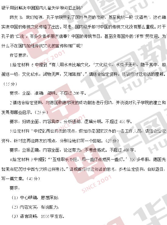 915公务员联考话题,考了近几年国家政策大谈特谈的一个热点--文化。十二五规划纲要中就明确指出要传承创新, 创造文化大发展大繁荣;但是在文化这个大热点中,小角度的选取却是极富创新色彩。话题并未从文化产业、文化教育等方面来写,而是从孔子学院说到了国际文化的交流。
